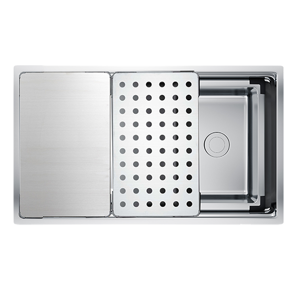 Thiết kế hiện đại với gờ hạ bậc – tích hợp phụ kiện thông minh: Siphon, giá úp bát inox, chậu rửa nhỏ, thớt inox, thớt inox lỗ