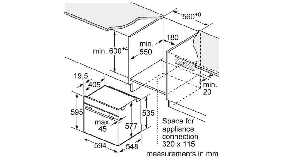 - Thiết kế âm tủ với kích thước lò là 595x595x548mm tinh giản, gọn gàng cùng với chế độ mở cửa lò hiện đại, êm ái bằng một nút nhấn.