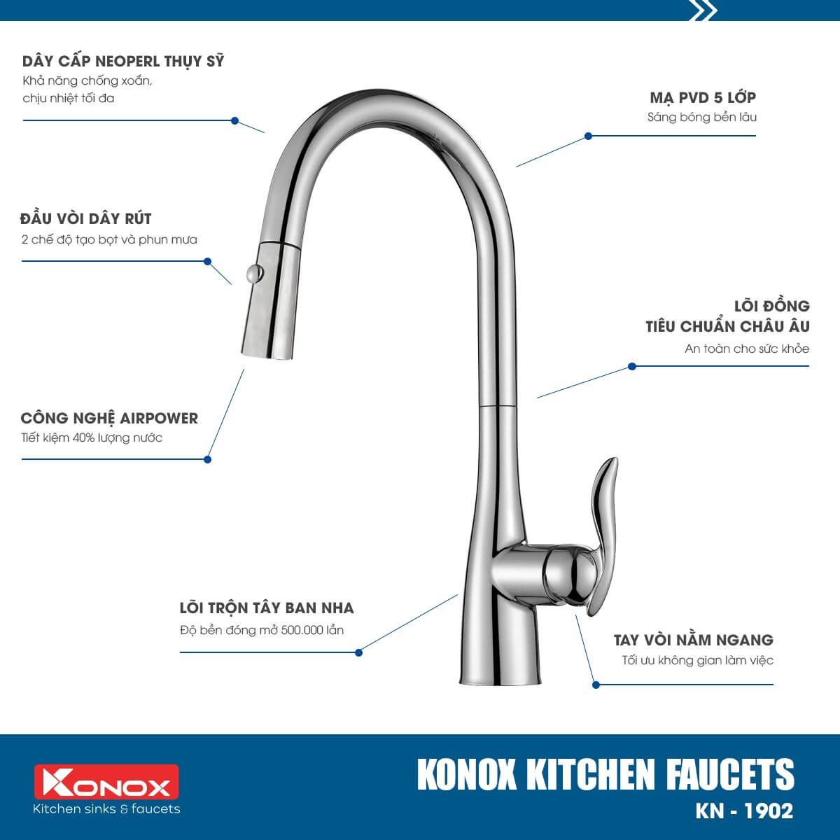 Vòi rửa Konox KN1902 được chế tạo từ hợp kim đồng 59% tiêu chuẩn Châu Âu CW617N