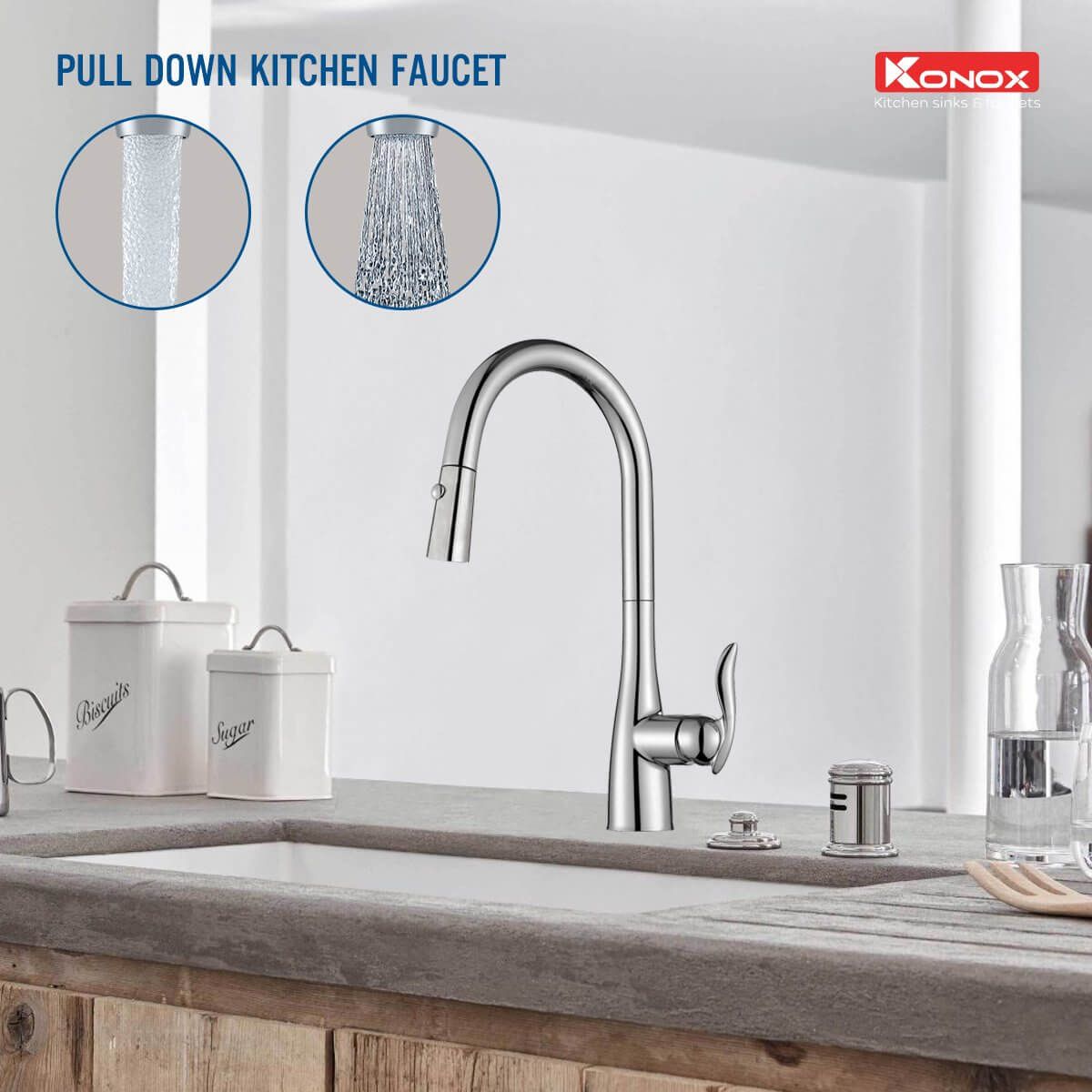 Thân vòi xoay linh hoạt 360 độ với cơ cấu khớp xoay mượt mà nhờ kết nối thân đồng tiêu chuẩn. Konox trang bị đồng bộ định hướng dòng chảy từ thương hiệu số 1 về giải pháp phụ kiện vòi nước tại Thụy Sĩ giúp tiết kiệm nước đồng thời tạo bọt khí chống bắn nước mang lại trải nghiệm tuyệt vời cho người dùng.
